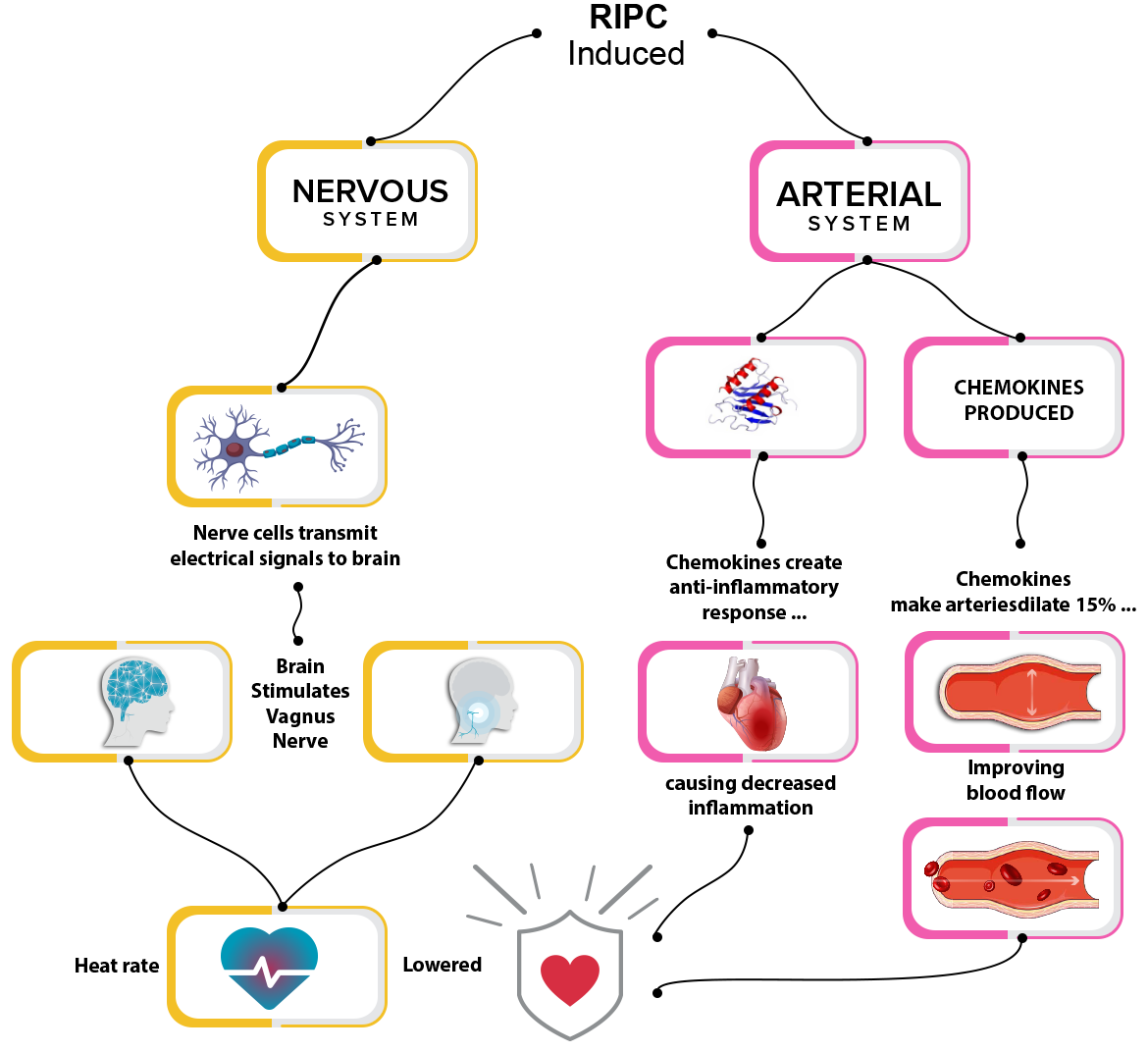 This triggers a pain signal to the brain (neuro signal) - Brain prepares the body for cardiac event. Decreasing the amount of energy that the tissue needs to survive by increasing the parasympathetic tone (rest and relaxation). Improves the flow of blood – Prepares the vascular system for cardiac event. Diminishes the inflammatory response and prepares the immune system. The attacking orders that the body produces (chemokines) are down regulated (less are produced). Dr.Rubinstein aims to use RIPC to precondition the heart, acting as a stimulus before ischemia occurs.